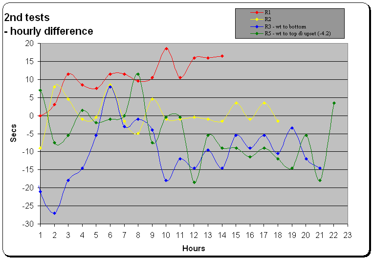 Run 5: Placed the weights back at the top, to check I could get the same as run 2. But I must have altered the spread in run 3, because I now gained over 4 minutes an hour. I also rewound the clock after 20 hours to see what that did.