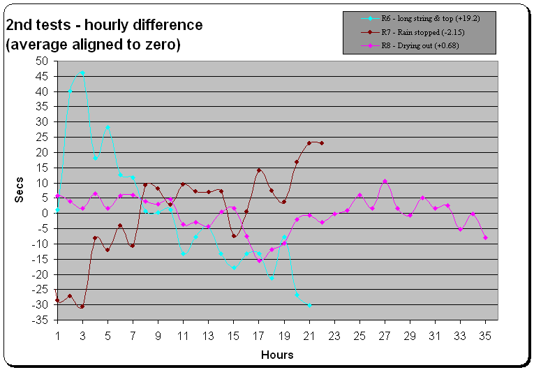 Run 8: Weather getting drier, but then it rained again after 14 hours. Up until these last 3 tests, it has generally been fine. I put a humidity gauge to see what happens and there was a big change down and then slowly up around 16 to 20 hours - and that made the clock run slower by around 15 seconds/hour. The humidity then slowly kept changing for the rest of the run. The clock was rewound at 22 hour. Eventually more rain and it stopped at tooth 43 again.