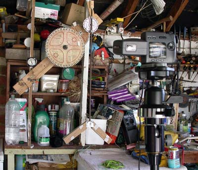 You can just spot the small bottle, top of the left upright, that is the driving weight. My camera is the fantastic Nikon 990, from 1999.