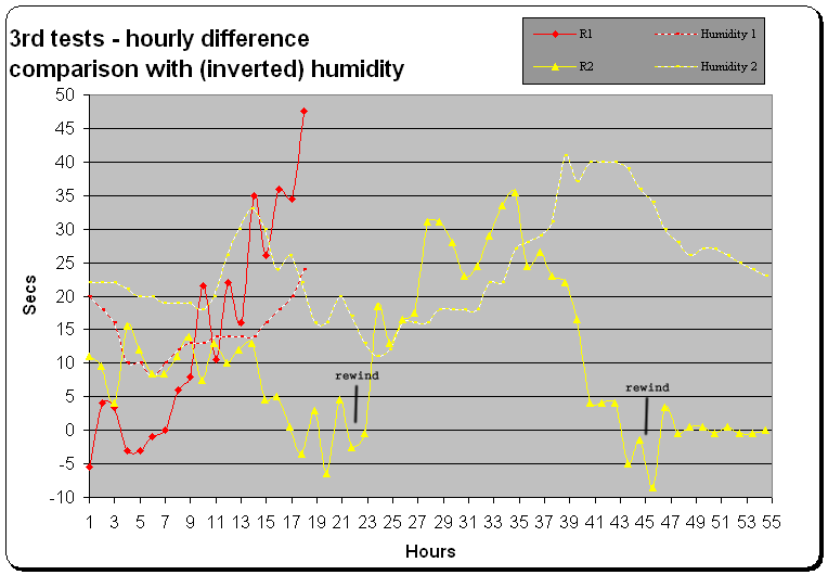 I have inverted the humidity so that high is down. The clock was rewound twice during the second run. There seems little point in trying to do accurate timings with so much variation.