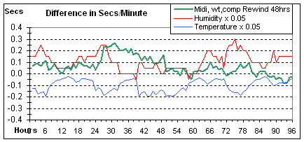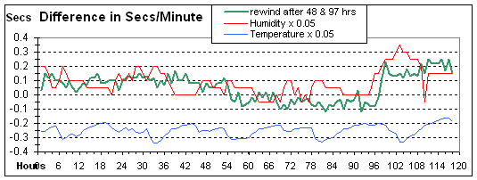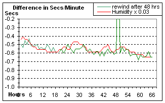 Humidity started at 59%, with a maximum of 63%. The rewind was not that good with a few pins jumping off the verge giving a gain of 10 seconds.