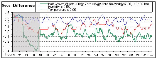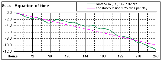 Just to confirm my testing I will go for a long run, taking a couple of days to roughly set it to the correct beat. The result is reasonable acceptable in that the clock is at most 1.6 minutes wrong at any instance and normally less than 1 minute wrong. The plot below shows the run compared to a constant loss of 1.25 minutes, which I can now easily adjust using the verge dial.