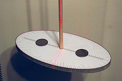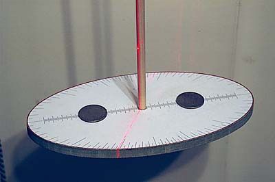 The main weight of the verge is at the bottom to stop the flapping that Clayton's design produces with just crescents at the tops. It is elliptical to emphasis movement, not for any weight consideration. These photos show the bottom weight at the end of each swing and a laser marker to see the swing angle and lateral movement - not quite a shafts worth. The temporary paper is marked like a clock with 60 minute divisions.