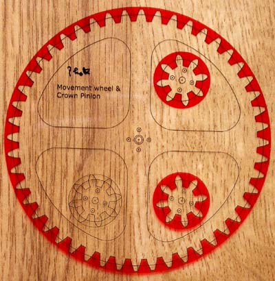 I shall use a reduced size Movement wheel and it's pinion for these tests - why reduced size? Well it will give me a harder practice and also ensure I do not use them in the final clock! If I build the whole clock from this MDF laminated flooring, I have an unfortunate problem in that I will have to join two pieces together to make the 8" Minute wheel, as the planks are only 7" wide. So, for this test, the 48 tooth wheel will be made from 2 pieces. But first the pinion...