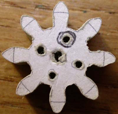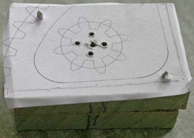 Opposite is the first set of drill holes for it. I attached 2 pieces of MDF together, holding them with 2 pins at the corners, before drilling out the centre, glued on the paper (spraying the glue on the paper, not the wood to make sure it did not enter the hole) and then drilled the connector holes. (Then poked through the middle hole up from the bottom - which is why it looks so ragged in the photo.)