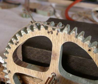 Firsts, I did a very simple experiment. Tied a bowline knot in a 32" length of very thin string and hung it off the teeth to see how well the wheel would turn when I let go (as shown opposite) - just the string, no real weight at all.. First I tested it on the (brass) arbor as purchased, doing a number of goes at each of the teeth 1, 13, 25 and 37. The wheel revolved 36 teeth for the first 3 and 38 when starting at 37.