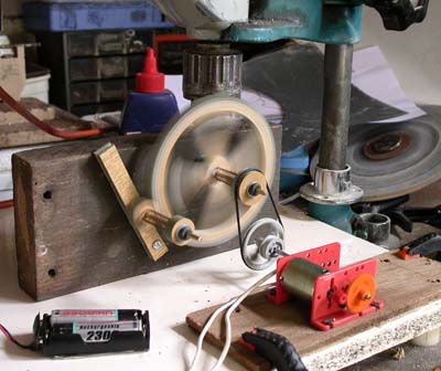 Here is my 'test' rig using a piece of wood held down by the drill and an old motor and a bit of Lego. I placed a couple of O-rings on the end of the arbors, just in case the wheels wanted to move, but it was not necessary as they seemed quite happy running in one position (despite the wobble of the non-flat large wheel). I cut out the spokes in a bit of a hurry and did not keep to the line (same old problem!) - so I had to balance the wheel before running the test. The 11cm diameter wheel weighted 2.6oz (74gm) before I cut and only 1oz (28gm) when I had finished cutting. I also used quite coarse sand paper (150) for sanding the teeth, but in real life I must use finer stuff. I did enjoy the blow tests - great to see the wheels free wheeling.