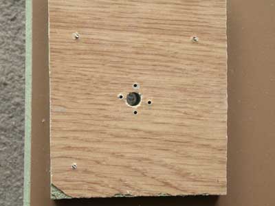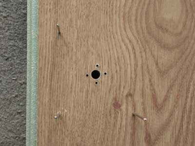 I am using some 12mm laminate flooring, as I do not have enough of the 8.5mm stuff. Apart from the fact that the holes are not at 90 degrees (apart from the 2 bottom left on the right image of the wheel), the wander is enormous as the wee drill bit goes through 1" of 2 layers of MDF.