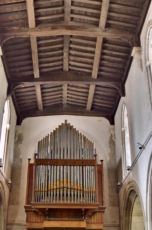 View of the roof timbers and the organ, which covers the two west windows