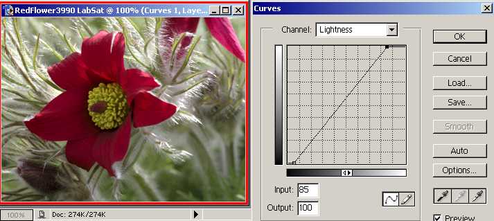 Move both curve end-points inwards to set the significant Shadow and Highlight points - here it is the dark area around the yellow and the sun catching the little hairs to the right of the flower. This will immediately add contrast to the image (flick back to see the difference) - more in the highlight than the shadow, but then we have reduced it quite a bit - 15 points out of a 100 [The L channel in lab goes from 0 to 100]. It is also important to note that these changes do not alter the colours at all - they are held in the a and b channels. So now lets go for colour... |
