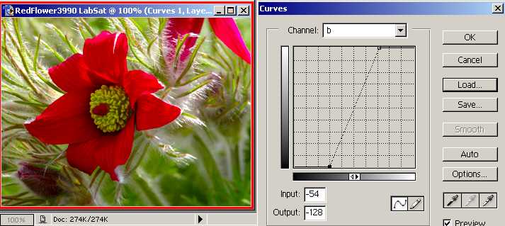 Not too bad, and very quick if you have the colour curving done with a button (action) click - remember to move them by the same amount - in this case by 74 points. Note the values go from -128 to +127 - so the points are -54 and +53. If you think this image is now too vibrant, all one has to do is reduce the opacity of the layer to suit, especially if you keep the tone and colour layers separate. But we could do a little better by tonal curving, so back to the L channel... |