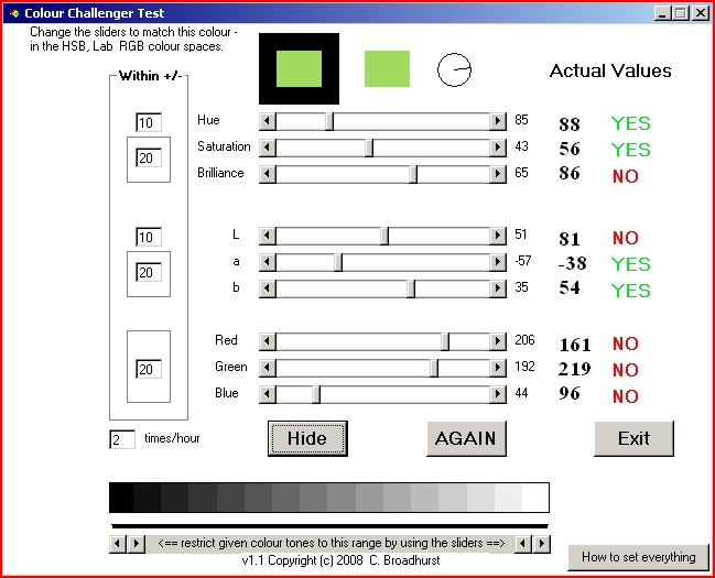 A Channel Challenge Fun IdeaI found it hard to guess the channel values that specify a specific colour, but I thought it would help my post-processing if I could - so I thought of a fun way of learning it. I wrote a program that randomly gives you a colour and you have to guess the channel values in HSB, Lab and RGB. The program initially allows a fairly large tolerance for error, but as you improve this tolerance can be reduced. The image below is a snapshot of one of my attempts, with wide tolerances. So it is a fun thing to do and while you are playing (I have mine prompt me once or twice an hour) one instinctively learns, but (with reduced tolerances, I still have not managed all the YESes - 8/9 is my best). So if you want to play, then download it, unzip and put the program anywhere on your PC. If you are not sure how well you can 'read' hues on your PC, then the Colour Clock program includes a test to determine that. Once you have learnt how to read a Hue clock, then the Colour Watcher program becomes much more useful. PS. It is a PC program and I did not include CMYK in the Guesser, as there is not a unique answer for each colour.