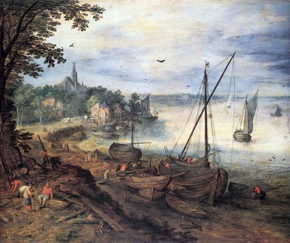 BRUEGHEL, Jan the Elder (1568 - 1625)River Landscape with LumbermenClick here to view the image (in a separate window) This painting is completely different from the preceding ones with far greater detail and clarity. It is delightful.
