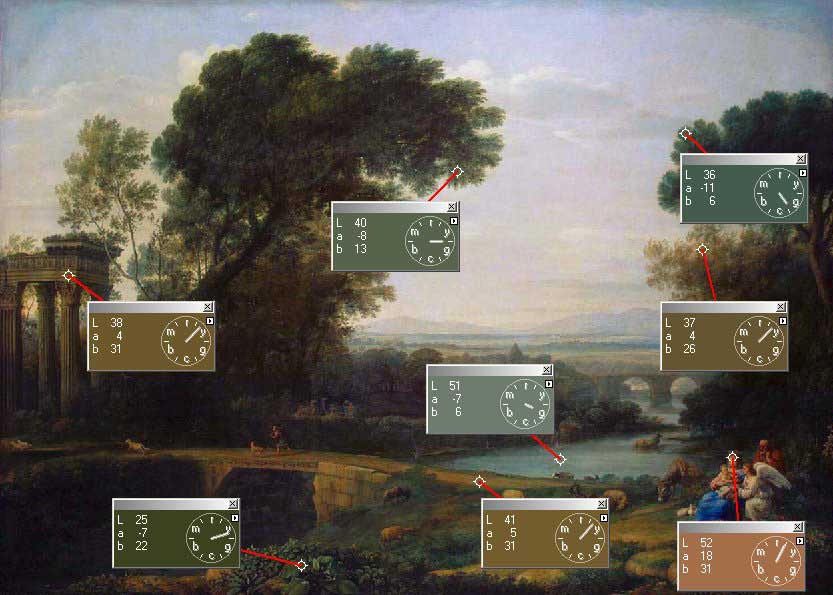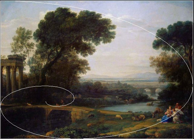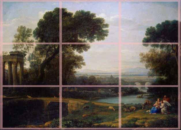 CLAUDE LORRAIN (1600-1682)Landscape with the Rest on the Flight into EgyptConstable described Claude Lorrain as "the most perfect landscape painter the world ever saw", and declared that in Claude’s landscape "all is lovely – all amiable – all is amenity and repose; the calm sunshine of the heart". There is a problem with the colouring of this image, as I also downloaded a detail of it which showed that the sky was blue. Click here to view the original image (in a separate window) I have attempted to correct the colour cast, not too well, to get this image (which I will work from). This is a very peaceful landscape and I think he has not reinforced the composition with strategic positioning.