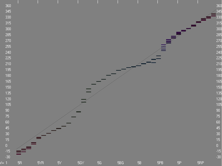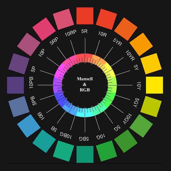 Munsell Colour SystemEver since I did perception experiments to see how one could differentiate colour Hues (using the HSB model) with my Colour Clock, I realised that we are not so good on the greens as the red/yellow (face) colours. Munsell defined a colour model using people rather than technology and the system is, I now believe, probably the best way to adjust images - but I've no idea how this could be implemented! Actually Munsell was the first to separate hue, value, and chroma into perceptually uniform and independent dimensions back in the early 1900s. He produced a colour book which showed more colours than is possible on today's sRGB colour space, which has a limited colour gamut designed to match that of televisions and computer displays.