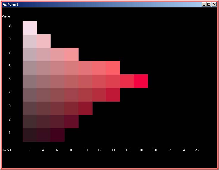 I have got a bit distracted by this thought and attempted to find his model defined in the RGB colour space. Although there are a number of sites showing his hues and conversion calculators; the examples did not agree when I downloaded them and compared their values. So I wrote a wee program to display them (using formulae from easyRGB and the Munsell and Yxy equivalent values), which I shall add to my Colour Watcher in due course, and the results agreed with both the Coloroid and the X-Rite Colour calculator for Munsell values. Here is my sRGB renditions of 7.5R.