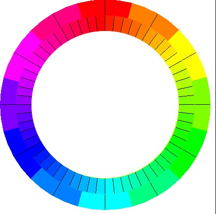 Now the serious aspect... We can run the clock in a slightly different mode to see how easy it is to tell changes in Hue - the whole clock changes from one hue to another at random-ish intervals. Unless you are perfect (i.e. a woman) and have an excellent display (i.e. expensive), I think you will not be able to tell all the Hues apart. I've included three hue shift increments, starting with 12 changes (i.e. the same as the hours on the clock), down to seconds (or 6 degrees of change). Every time the clock changes hue you need to press any key (spacebar is easiest) to say you have seen the change, and then at the end it will display which hue changes you missed.